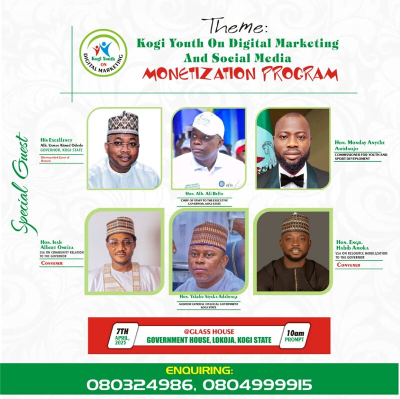 The Kogi State Government is set to endorse the Kogi State Youth Digital Marketing and Social Media Monetization Programme. This transformative initiative is spearheaded by the office of the Senior Special Assistant on Resource Mobilization to the Governor, Engr. Habib Amoka, and the Special Adviser on Community Relations, Hon. Isah Albert Omeiza, in partnership with Bamsiak General Enterprise.